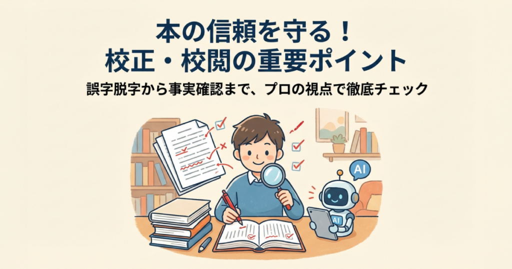 自費出版における校正と校閲の違いや重要性を解説します。誤字脱字や事実関係の誤りは著者の信頼を損ないます。著者自身で行うチェックポイントから、プロに依頼する場合のメリット、校正記号の基本まで。ミスのない美しい本を作るための必読ガイド。 -