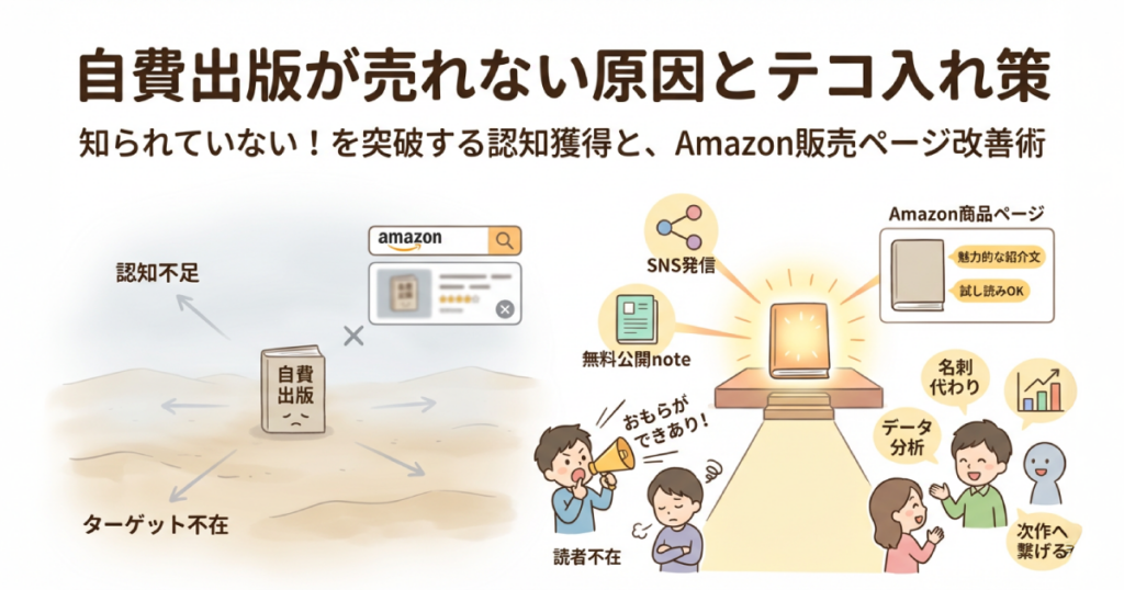 自費出版の本が売れない主な理由(認知不足、ターゲット不明確、表紙・タイトルの問題など)を分析し、売るためのテコ入れ策を紹介します。Amazonの最適化やSNS活用、試し読みなど。また、「売れない」と割り切る勇気や、在庫リスクのないPOD出版の活用についても解説。 -