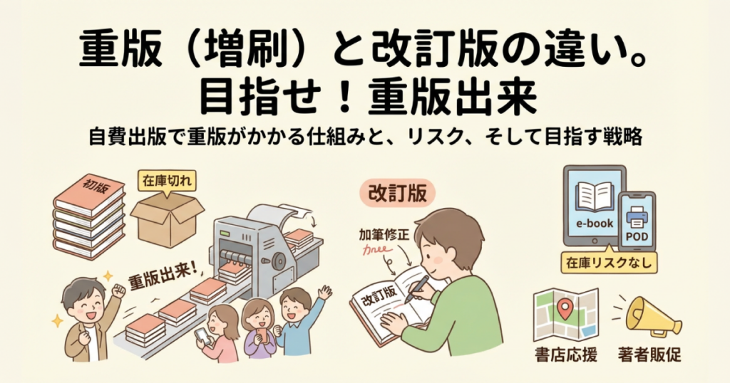 自費出版における「重版(増刷)」の仕組み、条件、費用、在庫リスクについて解説。重版を目指すための販売戦略(初速、口コミ、書店営業)も紹介。